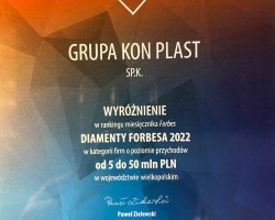Diamenty Forbesa 2022 - Wyróżnienie dla Grupy KON-PLAST sp. z o.o.