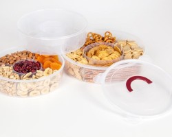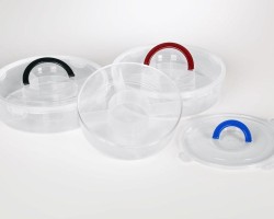 Der runde Behälter hat ein breites Anwendung. Eingebaute 6 Gitter und ein dichter Deckel mit einem Griff erleichtern das Aufbewahren.